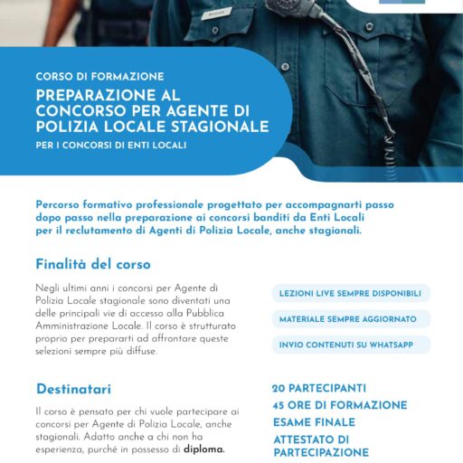 Percorso formativo professionale progettato per accompagnarti passo dopo passo nella preparazione ai concorsi banditi da Enti Locali per il reclutamento di Agenti di Polizia Locale, anche stagionali.